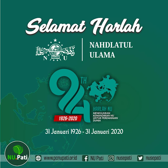 Besok, 31 Januari 2020, Nahdlatul Ulama genap berusia 94 tahun, menurut penghitungan kalender masehi. Untuk menyemarakkan peringatan hari lahir NU tersebut, admin NU Pati, telah mendesain beberapa gambar ucapan selamat Harlah ke-94 Nahdlatul Ulama.