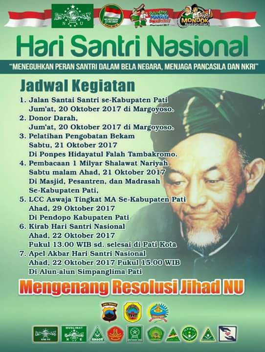 Pati. Santri selalu loyal untuk negeri. Hari Santri Nasional (HSN) yg jatuh pada 22 Oktober 2017 mengingatkan bangsa akan besarnya jasa para santri dlm mengusir penjajah, mempertahankan kemerdekaan, dan mengisi kemerdekaan dgn berbagai program, khususnya pendidikan dan ekonomi kerakyatan.