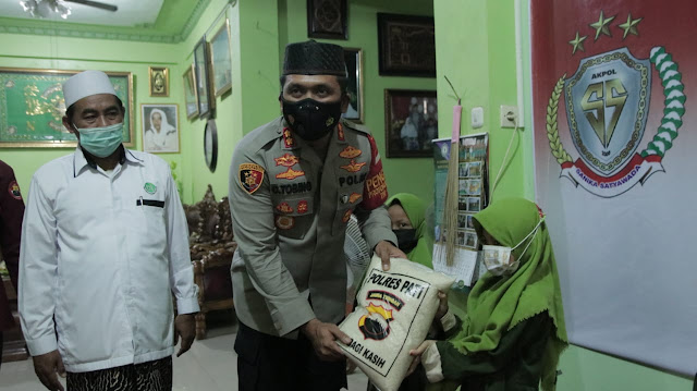 AKBP Christian Tobing (peci hitam) didampingi pengasuh PP Al Akrom, KH. Imam Al Mukromin (kiri) menyerahkan bantuan beras secara simbolik kepada salah satu santri Ponpes tersebut. |