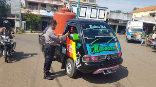 | Salah satu anggota Polsek Gembong membantu memberikan masker kepada pengendara yang melintas di depan Pasar Gembong |