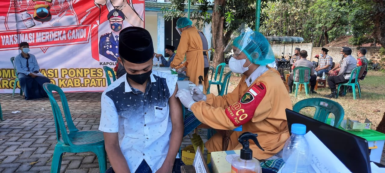 Seorang Santri Kajen sedang menjalani vaksinasi Merdeka Candi yang digelar oleh Polres Pati |