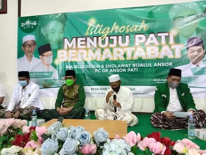 Istighosah yang digelar Majelis Dzikir dan Shalawat Rijalul Ansor (MDS RA) Pimpinan Cabang (PC) Gerakan Pemuda Ansor Pati dihadiri Rais Syuriyah PCNU KH Aniq Muhammadun dan