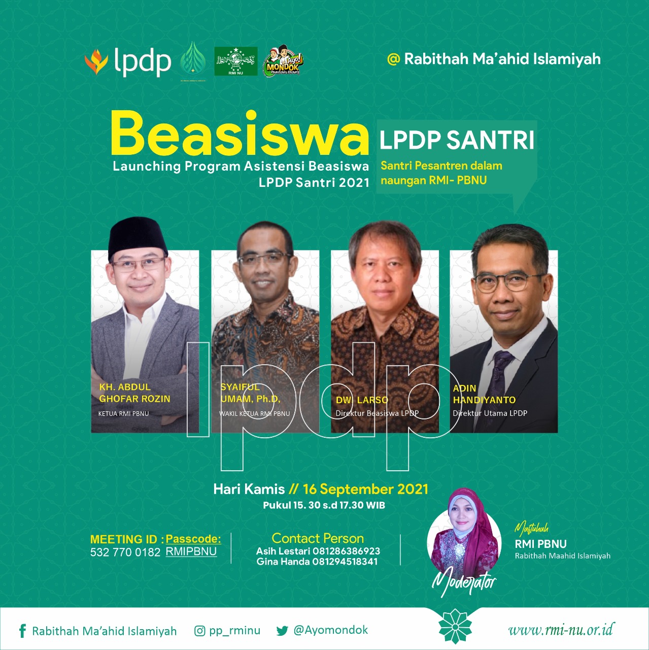 Agenda besar bertajuk LPDP Santri akan segera terealisasi. Pasalnya, pihak RMI NU, Kamis (16/9) akan mengadakan Launching Program Asistensi LPDP Santri 2021. Kegiatan ini rencananya akan disiarkan via zoom melalui link ini (klik di sini) pukul 15.15 WIB. sampai dengan pukul 17.30 WIB.