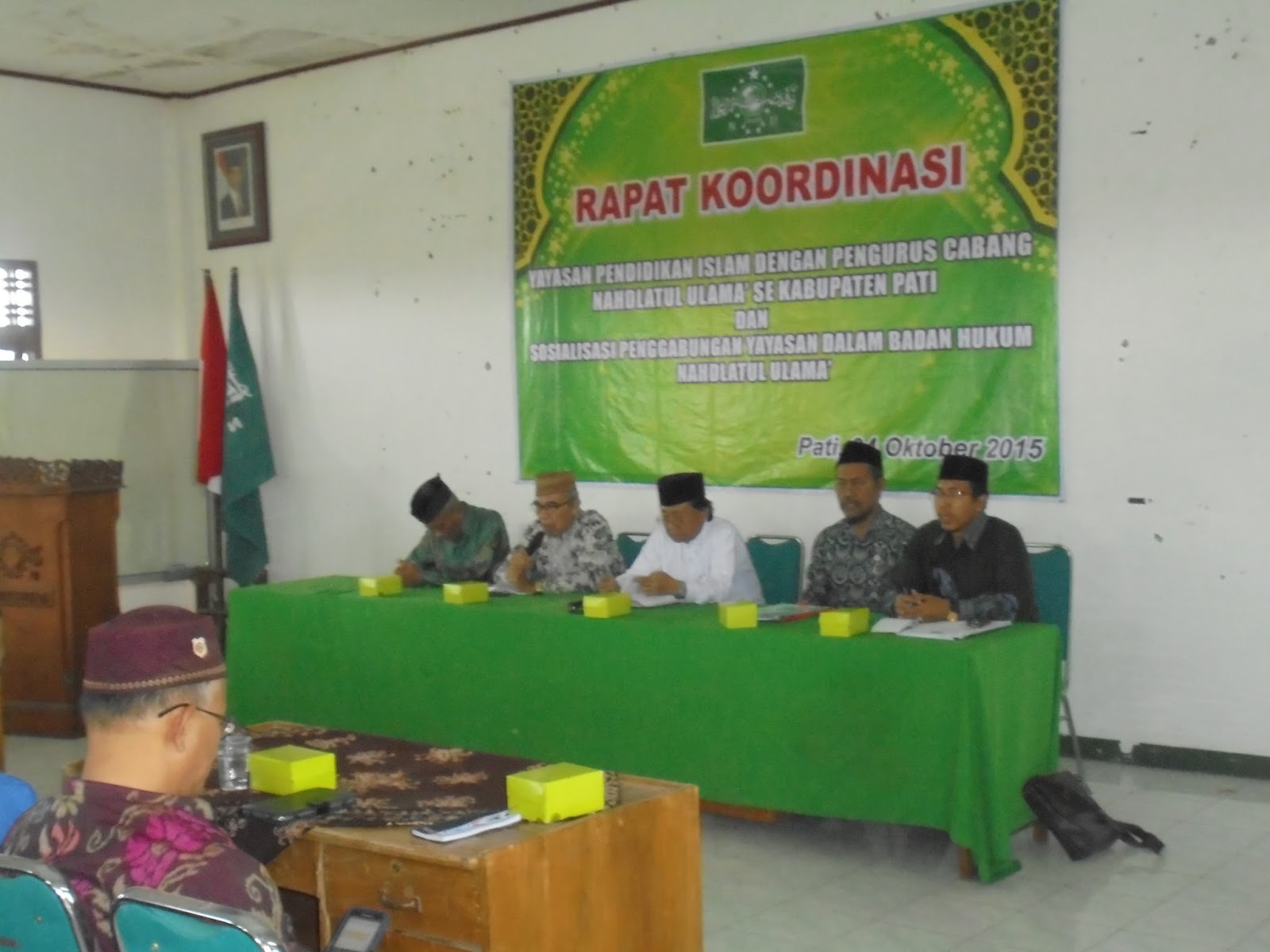 Warta NU, Pengurus Cabang Nahdlatul Ulama Kab. Pati pada hari Ahad, 4 Oktober 2015 bertempat di Aula PCNU Kab. Pati menyelenggarakan Rapat Koordinasi dan Sosialisasi tentang Badan Hukum Perkumpulan Nahdlatul Ulama. Undangan yang hadir dalam acara tersebut antara lain dari unsur Ketua-Ketua Yayasan, Kepala-Kepala Madrasah atau Sekolah yang didirikan oleh warga NU. ada sekitar 100 lembaga yang hadir memenuhi ruangan Aula PCNU.