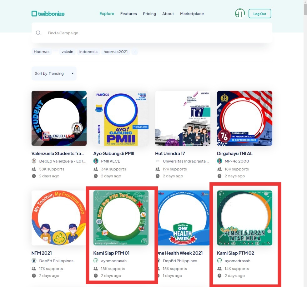 Twib ‘Siap PTM’ karya Ali Munir menempati posisi trending #6 dan #8 di portal twibbon terkemuka, twibbonize.com. sementara twib PMII Kece menempati posisi trending #2 di portal yang sama